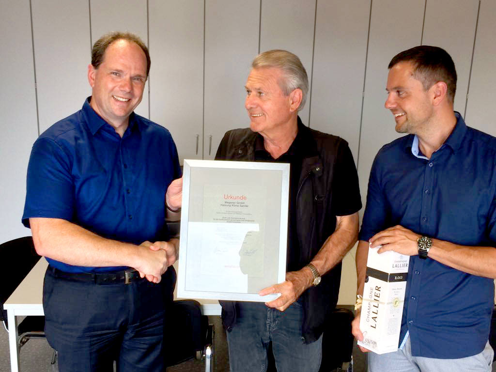 Aus diesem Anlass kamen auch der Niederlassungsleiter der Firma Max Weishaupt GmbH Herr Lörsch ( links ) und der Außendienstmitarbeiter Herr Zeußel ( rechts ) und gratulierten Wolfgang Wegener ( Mitte ). Eine Urkunde drückt die Anerkennung und den Dank für die kontinuierlich gewachsene und erfolgreiche Zusammenarbeit. Bemerkenswert dabei ist, dass am 01.08.1993, vor genau 25 Jahren, die Zusammenarbeit durch den Kauf eines zweistufigen Gasbrenners Typ: WG20N begann! Symbolisch steht die Max Weishaupt GmbH auch noch für viele andere Hersteller und Lieferanten, denen wir ebenfalls zu großem Dank verpflichtet sind.